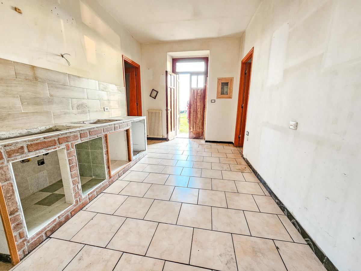 Il corpo principale della casa accoglie con un ingresso che si apre su un disimpegno funzionale e conduce a una zona giorno ampia e luminosa, dove la cucina abitabile, la sala da pranzo e l’ampio soggiorno creano ambienti caldi e conviviali, pensati per essere vissuti davvero. Il bagno con doccia completa il piano con praticità e comfort.